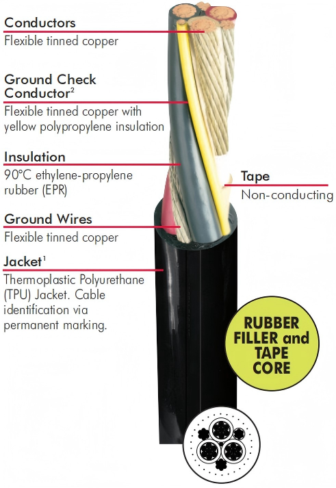 Three power conductors, ground wires, and ground check conductor cabled together into a round configurationJacket: