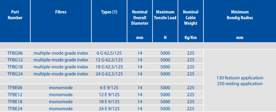 تتوفر خيارات متعددة لعدد الألياف تشمل 6 أو 12 أو 18 أو 24 ليفاً بصرياً، وهي متاحة في نوعين رئيسيين. النوع الأول هو Singlemode 9/125 μm المثالي لنقل البيانات لمسافات طويلة بتوهين منخفض جداً، والنوع الثاني هو Multimode 62.5/125 μm المناسب للتطبيقات قصيرة إلى متوسطة المدى داخل منظومات التحكم المحلية في الرافعة. كل ليف بصري محاط بطبقة طلاء مزدوجة (Primary and Secondary Coating) مقاومة للرطوبة والضغط الجانبي، مما يوفر حماية كاملة لنواة الزجاج من أي تشوه هندسي.
