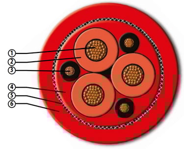 يُغلَّف الكابل بعد ذلك بغلاف داخلي وخارجي مصنوع من مركب مطاطي يتجاوز مواصفات 5GM5، يتميّز بلونه الأحمر المميّز الذي يُسهّل تحديده في بيئات التشغيل الصناعية المزدحمة. يُوفّر هذا الغلاف حصانة عالية ضد الزيوت الهيدروليكية والصناعية، والأوزون، والأشعة فوق البنفسجية، والرطوبة البحرية، وعوامل التآكل الكيميائي المختلفة.
