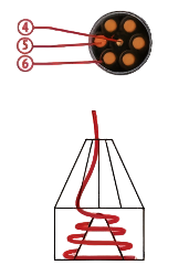 تُجمَّع الموصلات المعزولة في مجموعات سداسية مدمجة — Compact 6-Core Groups — قبل الوصول إلى التجميع الكلي للكابل. هذا الأسلوب الإنشائي يخدم غرضاً هندسياً محدداً: تقليل المسافات الداخلية بين الأنوية والحدّ من هجرة الأنوية تحت أحمال اللي الميكاني. التجميع المدمج يُوزّع إجهاد الثني بشكل متوازن عبر مقطع الكابل الكلي، مما يُقلل الإجهاد الموضعي عند نقاط التقاطع في سلة التجميع.