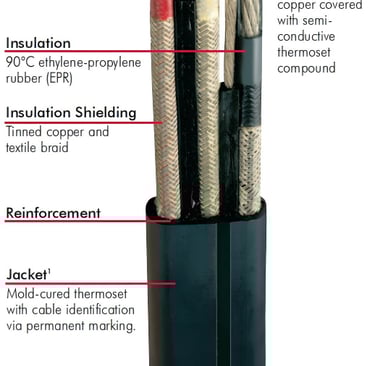 هذا النوع من الكابلات صُمم خصيصًا للاستخدام في الدوائر التي لا تتجاوز 2000 فولت، مع تركيز واضح على تشغيل المعدات العاملة تحت الأرض، وخاصة معدات الـ continuous miner التي تحتاج إلى موصلات تأريض وتدريع معدني حول كل موصل. وبفضل شكله المسطح وبنيته المرنة، يصبح التعامل معه أسهل في الممرات الضيقة ومسارات الحركة المتكررة داخل المنجم.