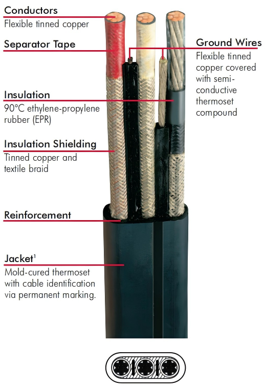 كابل SHD Flat 3/C بغطاء Mold-Cured للاستخدام في التعدين تحت الأرض