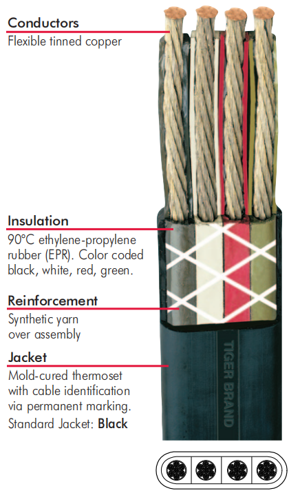 كابل النوع W المسطح رباعي الأسلاك بمعدل جهد 600/2000 فولت هو كابل طاقة مصمم خصيصًا لتشغيل المعدات المتنقلة في المناجم تحت الأرض التي تعمل بالتيار المتردد. يتكون من أربعة موصلات نحاسية مرنة معزولة بمطاط الإيثيلين-بروبيلين، ومحاطة بغلاف خارجي مقوّى بالصب الحراري، مما يجعله قادرًا على الأداء المستمر في درجات حرارة تصل إلى 90 درجة مئوية وسط بيئات تتضمن الزيوت والرطوبة وقوى الصدم الميكانيكي المتكررة.