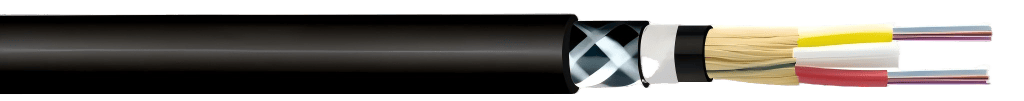 Yes. The cable is rated for unrestricted outdoor use including resistance to ozone, UV, and moisture. The all-dielectric construction — no metallic elements anywhere in the cross-section — eliminates galvanic corrosion as a failure mode, which is the primary mechanism by which metallic-armoured cables fail in salt spray environments over time. The polyether PUR sheath is hydrolytically stable and does not deteriorate on sustained salt water contact. The non-hygroscopic reinforcement braid maintains its mechanical properties wet or dry, and does not support the progressive ionic contamination of splice points that absorptive fibre constructions can promote. For truly immersed installation points, additional IP-rated enclosure protection at termination locations is recommended.