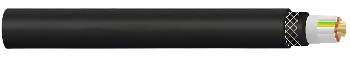 The conductor system is made from bare copper wires, finely stranded to Class 5 according to IEC/EN 60228, ensuring high flexibility and resistance to fatigue under repeated bending and acceleration in drag chains and trolley systems. Class 5 stranding distributes mechanical stress across many fine wires, reducing the risk of strand breakage when the cable is reeled, festooned, or looped over long travel lengths. Insulation is based on a polyester compound, with core identification following DIN 0293-308: up to five cores are color-coded, while six or more are white with printed numbers, with optional green/yellow protective conductors for earthing. Cores are stranded in layers around a central supporting element of aramid yarns, which absorbs tensile forces and limits stretch, protecting the copper conductors from excessive mechanical load in vertical or long-travel runs. Around this core bundle, a halogen-free PUR inner sheath is extruded, followed by a textile braid reinforcement and then a black, matt halogen-free PUR outer sheath with inkjet marking for traceability and maintenance tracking.