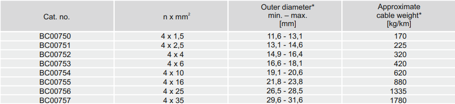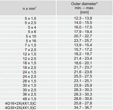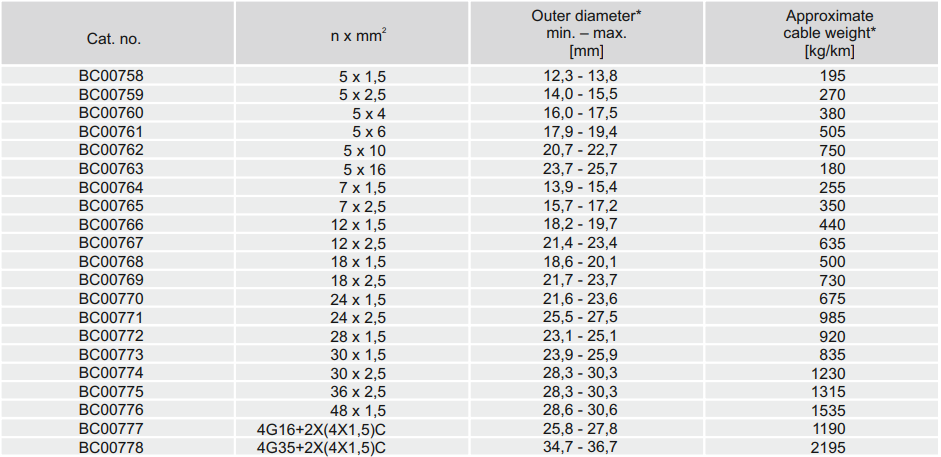 Available configurations span from 4 to 48 cores, with standard cross-sections from 1.5 mm² to 35 mm², enabling both power and multi-core control functions within a single cable family. Typical variants include simple 4-core power cables (for example 4×1.5 mm² up to 4×35 mm²) and multi-core control versions such as 12×1.5, 18×1.5, 24×1.5, 30×2.5, and 48×1.5 mm² for complex crane control circuits. Hybrid constructions like 4G16+2×(4×1.5)C or 4G35+2×(4×1.5)C combine power cores with bundled control pairs, reducing cable count and simplifying cable management along booms and festoon systems. Outer diameters typically range from about 11.6 mm to 36.7 mm, with approximate cable weights from around 170 kg/km to 2,195 kg/km, parameters that influence drag chain selection, support spacing, and reeling drum sizing. When selecting conductor cross-section, engineers should calculate load current, consider ambient temperature, grouping factors, and installation method (fixed or movable), and then reference DIN VDE 0298-4 current ratings and voltage drop limits to ensure both thermal and electrical performance.