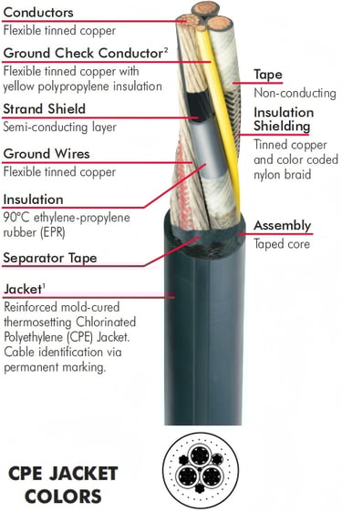 A: Standard jacket color is black. Colored Extra-Heavy-Duty (EHD) CPE jackets are available in blue, green, orange, yellow, and red. Color and stripe combinations are also available for CPE round jacketed cables, allowing further circuit differentiation. TPU jacketed cables are available in solid colors only. Colored jackets maintain physical properties equal to standard black jackets and can significantly improve mine safety by enabling easy visual circuit identification and equipment assignment.