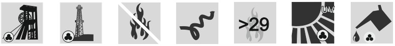 Fire behaviour is tested to DIN EN/IEC 60332-1-2, which evaluates the flame-retardant behaviour of a single insulated cable. The oxygen index exceeds 29, meaning the cable requires an atmosphere of more than 29 % oxygen to sustain combustion — significantly above the 21 % ambient oxygen level in normal air. This is an important safety metric in underground mining, where fire propagation in confined headings must be minimised.