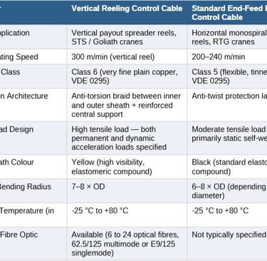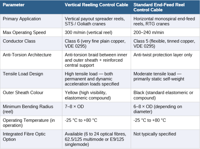 The table below illustrates the key specification differences between a cable engineered for vertical payout applications and a standard monospiral reel control cable used in end-feed or festoon configurations. Project engineers who apply standard reel cable to a vertical spreader application are making the single most common and costly selection error in this product category.