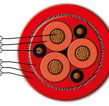 Each phase core incorporates an integrated ground conductor, also enclosed with a semiconductive layer, positioned symmetrically within the cable cross-section. This design ensures consistent and balanced grounding performance regardless of the instantaneous bending state of the cable, and provides the protective earth continuity required by crane electrical safety standards. The symmetrical arrangement also contributes to the cable's torsional neutrality — balanced mass and stiffness distribution around the cable axis reduces the tendency to develop net torsional moment under bending loads.