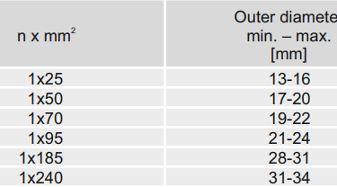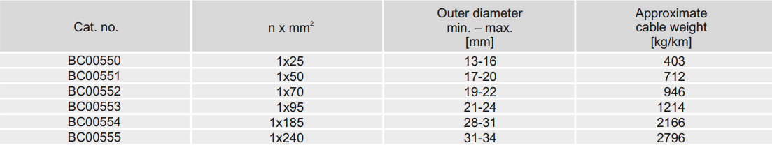 The multi-core (N)3GRDC5G-J range covers configurations from 4×1.5 mm² through to combined layouts such as 3×95+3×16 mm², with outer diameters from approximately 13 mm to 49 mm. The single-core (N)3GRDC5G-O variant spans from 1×25 mm² to 1×240 mm², with cable weights from 403 kg/km to 2,796 kg/km across this range.