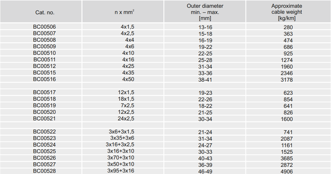 The cable is rated for drag chain (energy chain) applications as well as open festoon systems. The key parameter to verify for drag chain use is that the chain's internal bend radius at the reversal point must be equal to or greater than five times the cable's outer diameter. The cable should also be selected to fit within the chain's usable cross-sectional space without being compressed or forced into a non-round configuration, as this would compromise its intended bending geometry. The tensile load rating of 15 N/mm² per conductor provides a meaningful safety margin for drag chain runs where the cable may carry a portion of the chain's self-weight.
