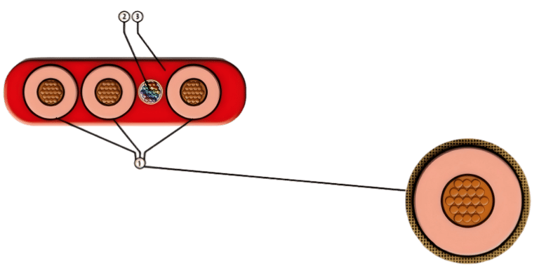 Conductor Layer: Each phase conductor is assembled from fine-stranded annealed copper wires. The high strand count — characteristic of Class 6 flexible conductors per IEC 60228 — delivers the tight bend radius tolerance that repetitive drum cycling demands. Unlike solid or coarser-stranded conductors, fine-wire construction distributes mechanical stress across thousands of individual filaments, dramatically reducing fatigue-related conductor fracture over the cable's service life.