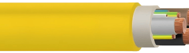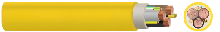 Insulation is XLPE (cross-linked polyethylene) per IEC 60502-1, chosen for its thermal stability and resistance to deformation under load. The inner sheath uses a special PUR compound, while the outer sheath is PUR in a distinctive yellow (dull) finish — a colour widely associated with mining and safety-critical cable installations. Cores are identified as black, brown, grey, and three green-yellow protective earth conductors, with pilot cores in white and blue located in the outer interstices.