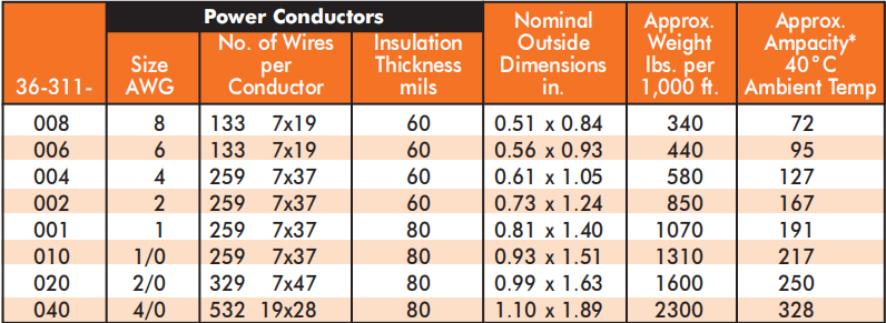 What conductor sizes are available in TYPE W FLAT 2/C cable? Standard conductor sizes range from 8 AWG through 4/0 AWG, with ampacity ratings from 72 amperes at 8 AWG up to 328 amperes at 4/0 AWG, based on continuous duty at a maximum conductor temperature of 90°C in a 40°C ambient environment.