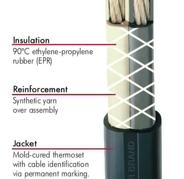 What is the difference between EPR insulation and cross-linked polyethylene (XLPE) in mining cables? Both EPR and XLPE are thermoset dielectric materials with excellent electrical properties and resistance to moisture and chemical exposure. EPR offers superior flexibility, particularly at low temperatures, and better resistance to tracking and partial discharge in contaminated environments. XLPE has somewhat higher thermal aging resistance and is used in mine power feeder cables rated at higher voltages. For trailing cable applications in the voltage range addressed by TYPE W FLAT 2/C cable, EPR is generally the preferred insulation because of its flexibility and environmental resistance.