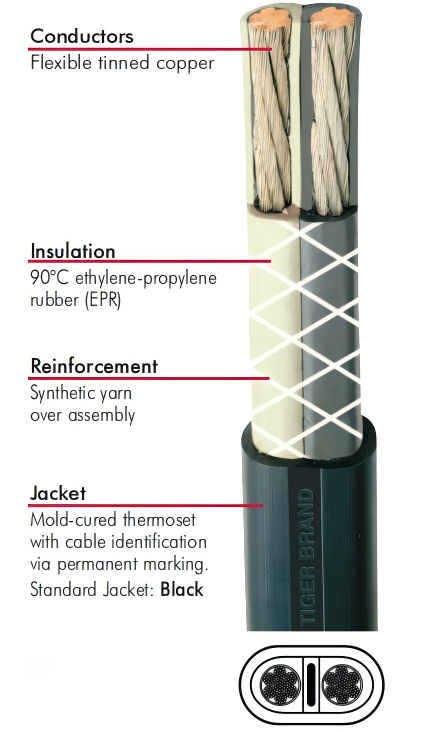 EPR insulation has inherently low moisture absorption — it does not swell, soften, or lose dielectric strength when wet. The mold-cured jacket provides an additional moisture barrier that prevents water ingress into the cable core. This combination allows TYPE W FLAT 2/C cable to operate in wet conditions without the accelerated electrical degradation that affects moisture-sensitive insulation systems.