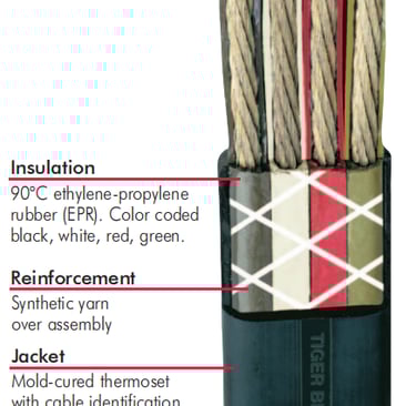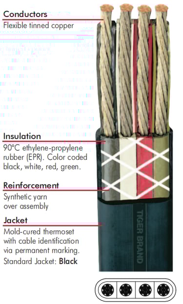 Mold-Cured Jacket describes how the outer protective layer is formed. During manufacturing, the jacket compound is vulcanized under heat and pressure in a mold, creating a dense, uniform protective layer that is chemically bonded to the cable assembly beneath it. This process produces a jacket with superior resistance to compression cuts, abrasion, and fluid penetration compared to extruded-only jacket designs.