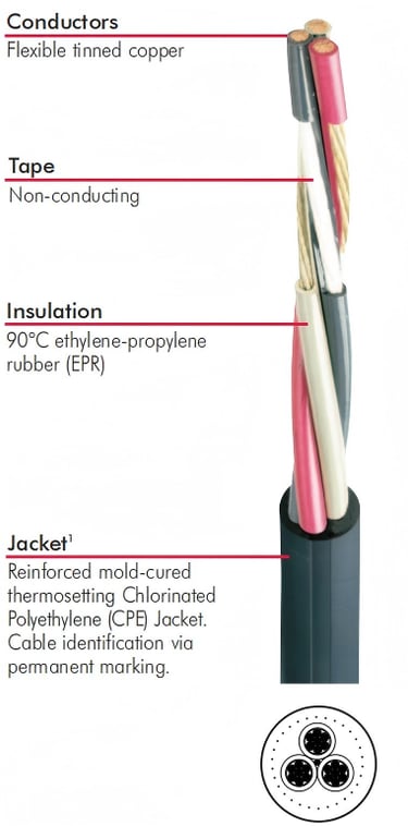 Featured Snippet: A Type W Round 3/C 2000V mining cable is a three-conductor, round-profile power cable rated at 2,000 volts and designed for mobile underground mining equipment. It uses flexible tinned copper conductors insulated with ethylene-propylene rubber (EPR) and protected by a mold-cured chlorinated polyethylene (CPE) jacket. It is suited for applications where bare grounding conductors are not required. The recommended maximum continuous conductor temperature is 90°C.