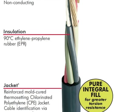 Each conductor is individually insulated with 90°C ethylene-propylene rubber, universally referred to as EPR insulation. EPR is the insulation of choice for mining trailing cables for several compelling reasons.
