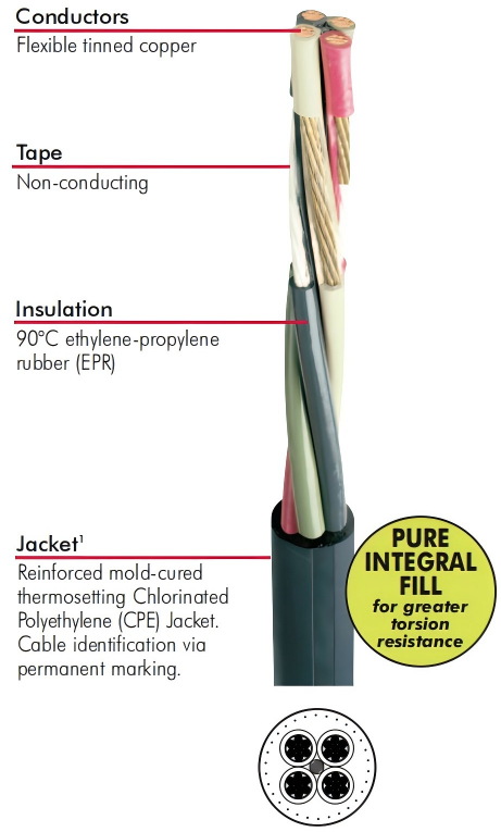 The outer jacket of a Type W Round 4/C cable is made from reinforced mold-cured thermosetting chlorinated polyethylene, commonly known as CPE. This is not an extruded jacket applied as a simple coating; it is a mold-cured compound, meaning it is processed under heat and pressure in a mold to achieve a higher degree of crosslinking and toughness than conventional extrusion-applied jackets.