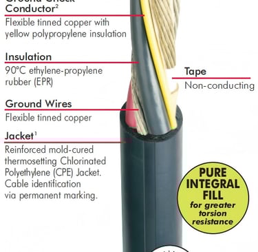 The ground check conductor is a smaller, insulated conductor — typically covered in yellow polypropylene insulation for immediate visual identification — located at the center or within the assembly of the cable. It does not carry power; instead, it is integrated into a monitoring circuit that continuously checks whether the grounding conductors maintain electrical continuity.