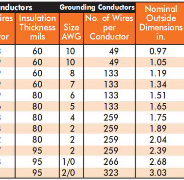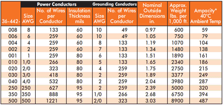 A: The cable is available in a range from 8 AWG through 500 kcmil in the power conductors. Grounding conductor sizes are matched to the power conductor size per applicable standards. Larger kcmil sizes are available in the 250, 350, and 500 kcmil range for high-ampacity applications such as large continuous miners or high-powered loading machines.